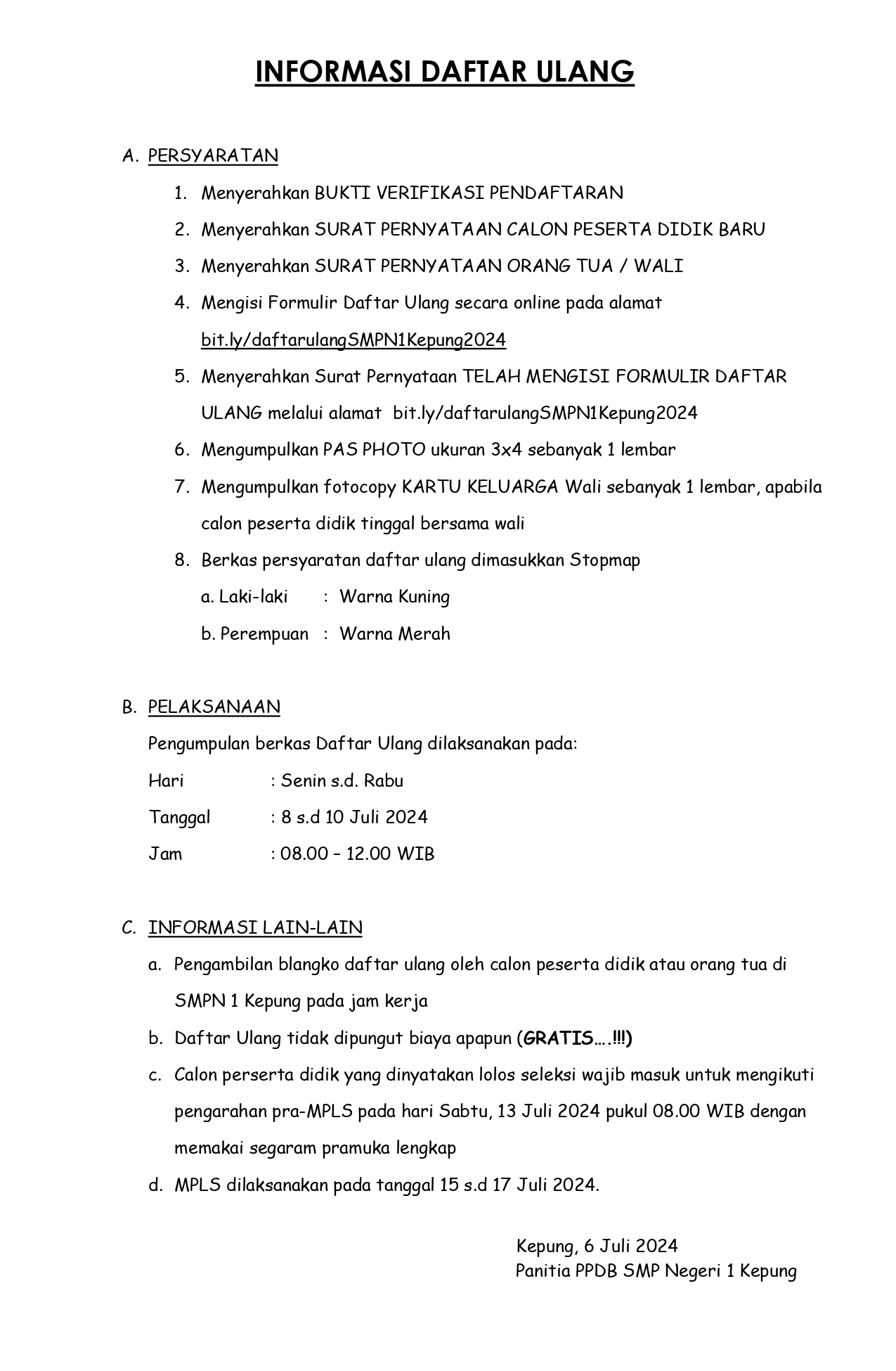 DAFTAR ULANG CALON PESERTA DIDIK BARU TAHUN AJARAN 2024/2025